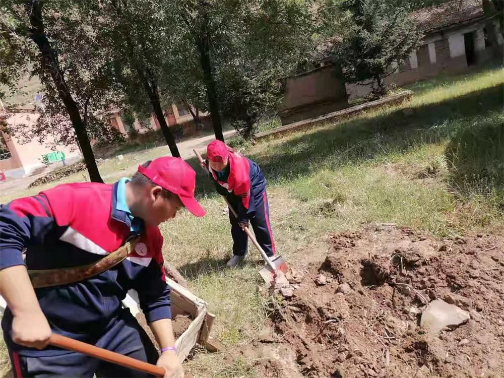 干活的途中,不少孩子手上都磨出了大水泡,我们的卫生员在细心的给孩子涂药水,以防感染!